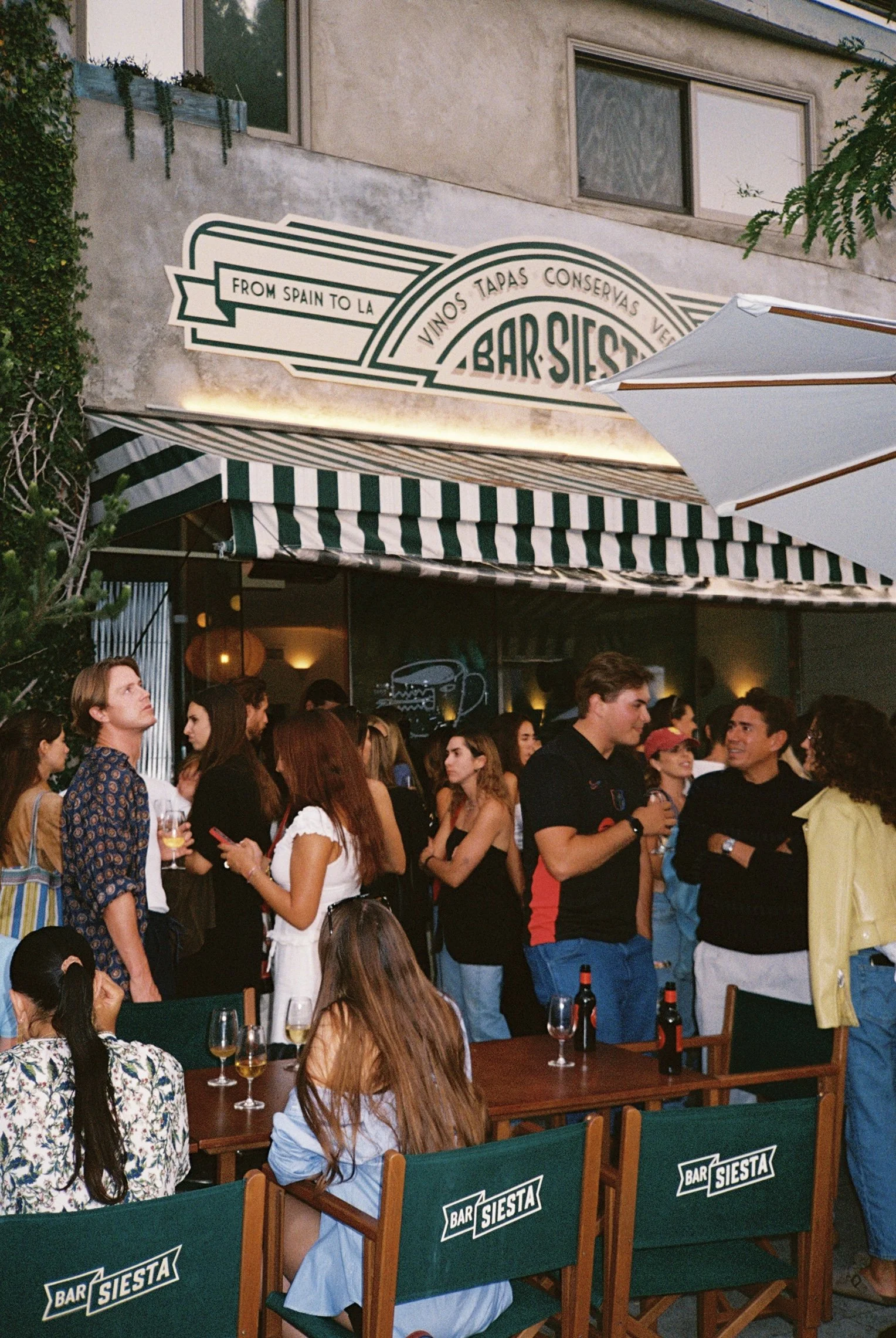 A lively outdoor scene at a bar called Bar Siesta with crowd of people socializing, some holding drinks, in front of a building with a green and white striped awning and a sign that reads "from Spain to LA."